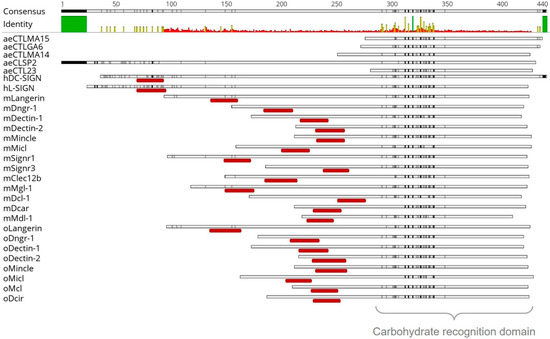 Alignment of 28 C-type lectin receptor amino acid sequences (ae: Aedes aegypti, h: Homo sapiens sapiens, m: Mus musculus, o: Ovis aries). Amino acids similarity analysed with Score Matrix Blossum62 (Threshold 1) and symbolised in light grey (60–79% similarity), dark grey (80–99%), and black (100%). Hydrophobic part, indicating a transmembrane region, marked in dark red below the sequence. Above, consensus and mean pairwise identity over all amino acid sequences shown (green: 100% identity; yellow: 30–99%; red: <30%). Mosquito amino acid sequences were obtained from VectorBase and mammalian sequences from NCBI (Table 1 and Table 2). Sequence analysis was performed, and figures were prepared using the Geneious Prime software.