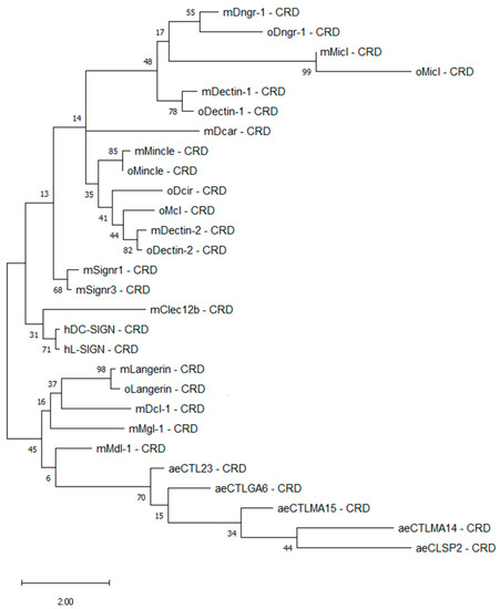 Maximum likelihood phylogenetic analysis of the carbohydrate recognition domain (CRD) of 28 C-type lectin receptors. Amino acid sequences of the respective CRDs were modelled by using bootstrap with 500 replications with the Jones–Taylor–Thornton plus frequency model and a discrete gamma distribution with five rate categories. Percentage frequencies from the bootstrap procedure are shown at each knot. Mosquito amino acid sequences were obtained from VectorBase, while mammalian sequences were from NCBI (Table 1 and Table 2). ae: Aedes aegypti, h: Homo sapiens sapiens, m: Mus musculus, o: Ovis aries. Phylogenetic analysis was performed with MEGA Software.
