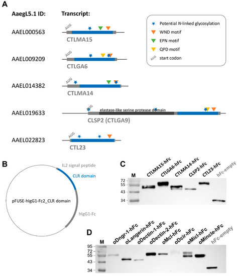 Mosquito CLR–hFc fusion proteins: (A) schematic overview of five Aedes aegypti transcripts (―) encoding for CTLDcps. Open reading frame is marked in grey, and nucleotides extracted for produced hFc–fusion proteins are highlighted in blue. Start codon and four conserved genetic motifs symbolised, as shown in the legend. AaedL5.1 CLR nucleotide sequences were obtained from VectorBase; (B) vector map of CLR domain ligated into pFUSE–hIgG1–Fc2 (Invitrogen); (C,D) Western blot image of anti-hFc stained mosquito (C) and ovine (D) CLR–hFc fusion proteins and hFc-empty control. Lane M: protein molecular standard, in kDa.