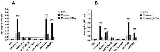 Mosquito CLR–hFc fusion protein interaction to mannan and zymosan: (A) ELISA-based screening of mannan with five mosquito CLR–hFc fusion proteins, in the presence and absence of EDTA. mDectin-2/oDectin-2 are known to recognise mannan (positive control) [35,41] and hFc-empty employed as negative control. One representative of n = 4 (EDTA n = 2) independent experiments shown; (B) ELISA-based screening of zymosan with five mosquito CLR–hFc fusion proteins, in the presence and absence of EDTA. mDectin-1/oDectin-1 are known to recognise zymosan (positive control) [35,43] and hFc-empty employed as negative control; (A,B) to discard possible false positives, the dotted line represents the cutoff defined as the threefold margin of the absorbance value relative to hFc, based on previous screenings with the CLR–hFc fusion protein library [34,46]. Data are depicted as mean + SEM of duplicates. One representative of n = 4 (EDTA n = 2) independent experiments is shown. One-way ANOVA, along with subsequent pairwise Tukey tests, was performed to compare the binding of the CLR–hFc fusion proteins above the threshold to PBS control and the EDTA supplementation each; **** p < 0.0001.