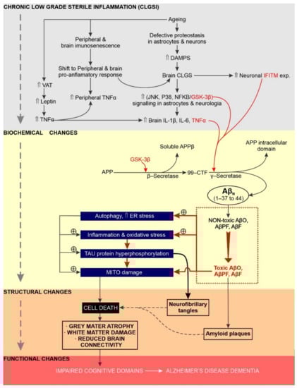 Human ageing, the most important of all risks for development of AD, is associated with a gradual transition of an acute inflammatory response to a systemic low-grade chronic inflammation (SCI). SCI is triggered by damage associated molecular patterns (DAMPS, e.g., non-encapsulated MITO DNA, dysfunctional organelles, misfolded and/or oxidized endogenous proteins, mRNA from necrotic cells, heat shock proteins, high mobility group box 1, Aβ peptides and oligomers) in the absence of an interaction between pattern recognition receptors (PRRS) on innate immune cells and evolutionarily conserved pathogen-associated molecular patterns (PAMPS). The presence of SCI in older individuals is evidenced by increased blood levels of pro-inflammatory cytokines, chemokines and acute phase proteins and an increased expression of pro-inflammatory genes that ultimately accelerate ageing by stimulating the development of chronic disorders, reduced general health and lifespan. For example, the pro-inflammatory cytokine tumour necrosis factor α (TNFα) promotes insulin resistance in adipocytes which leads to development of diabetes type 2 and an increased risk for diabetes type 2 promotes cardiovascular neurodegenerative, cancer and autoimmune diseases [,,,].