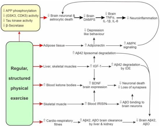 - a low PA, associated with a reduced release of cytokines and myokines from skeletal muscle cells during contraction, reduces the positive effect of these muscle molecules on attenuating systemic inflammation [] and promotes the development of type 2 diabetes, sarcopenia, depression, and different types of dementia including Alzheimer’s disease [];