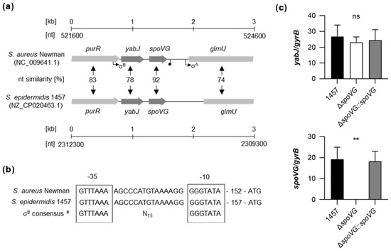 Genetic organization of the yabJ-spoVG locus in staphylococci. (a) Schematic representation of the yabJ-spoVG regions in S. aureus Newman and S. epidermidis 1457. Open reading frames (ORFs), promoters, terminators, and nucleotide similarities between homologous ORFs are indicated. (b) Nucleotide sequences of the σB-promoter regions in front of yabJ. σ-factor binding sites are framed. #, σB-promoter consensus motif of S. aureus derived from reference [38]. (c) Quantitative transcript analyses of yabJ and spoVG by qRT-PCR in S. epidermidis 1457, 1457 ΔspoVG, and 1457 ΔspoVG::spoVG cells grown in TSB at 37 °C and 225 rpm for 3 h. Transcripts were quantified in reference to the transcription of gyrB (in copies per copy of gyrB). Data are presented as mean + SD of five biological replicates. **, p < 0.01; ns, not significant (Kruskal-Wallis test and Dunn’s multiple comparisons test. Only differences between 1457 and mutants are shown).