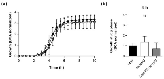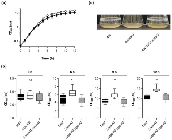 In order to determine the impact of the spoVG deletion on in vitro growth, the strain triplet was first cultured under static conditions in 96-well microtiter plates on an oCelloScope system [39] in Luria-Bertani (LB) broth at 37 °C and 5% CO2 (Figure 2). Under these microaerophilic growth conditions, all three strains exhibited comparable growth kinetics (Figure 2a), although 1457 ΔspoVG cultures tended to produce slightly higher cell densities after 4 h of growth than wild-type and 1457 ΔspoVG::spoVG cultures (Figure 2b), however, this effect was not statistically significant (p ≥ 0.275, Kruskal Wallis test and Dunn’s multiple comparisons test).