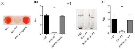 Effect of the spoVG deletion on in vitro biofilm formation of S. epidermidis strain 1457. (a,b) Biofilm growth of S. epidermidis strains 1457 (black symbols), 1457 ΔspoVG (white symbols), and 1457 ΔspoVG::spoVG (grey symbols) in a static 96-well microplate assay. Cells were incubated for 18 h at 37 °C in TSB. (a) Representative images of safranin-stained biofilms formed at the bottom of the wells. (b) Absorption rates of safranin-stained biofilms at 530 nm. The data show the mean + SD of six biological replicates carried out in triplicate. (c,d) Biofilm growth of the strain triplet under dynamic conditions in glass tubes. (c) Representative image of safranin-stained biofilms formed on the glass surfaces after 18 h of growth in TSB at 37 °C and 150 rpm. (d) Absorption rates of safranin-stained biofilms at 530 nm. The data show the mean + SD of six biological replicates. ** p < 0.01 (Kruskal-Wallis test and Dunn’s multiple comparisons test, only differences between 1457 and mutants are shown).