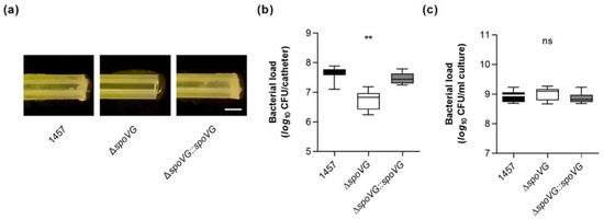 However, we cannot exclude that at least part of the CFUs obtained from the 1457 ΔspoVG co-incubated catheter tubing originated from the bacterial cell population, which grew planktonically in the culture medium (Figure 5c), although catheter fragments were carefully washed prior to the detachment of adherent bacterial cells from the catheter surfaces by sonication. It should be also noted here that CFU determinations of detached biofilms might underestimate the real number of viable cells in these biofilms, as sonication of detached biofilms does not necessarily dissolve all bacterial cells from the ECM and might leave some smaller or even larger cell aggregates [42], which would also yield, similar to individual cells, in single colonies (if cultured on agar plates).