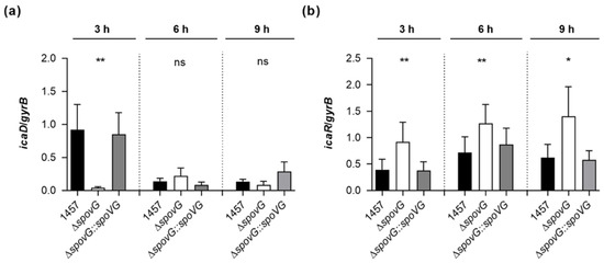 S. epidermidis strain 1457 is known to form a PIA-dependent biofilm under in vitro conditions [37]. Given the clear impact of the spoVG deletion on the in vitro biofilm formation capacities of strain 1457, we assumed that SpoVG might influence PIA production via the transcriptional control of the ica locus. To test this hypothesis, we quantified the transcription rates of icaD, which is part of the icaADBC polycistronic transcript encoding the protein machinery required to synthesize PIA, and of icaR, encoding a repressor of icaADBC [43], in TSB cultured cells by qRT-PCR (Figure 6). In line with our earlier observations [22], we detected the highest icaD transcript rates during the early growth phase (i.e., 3 h of growth) in TSB cultured 1457 cells, underlining the growth phase-dependent transcription of the icaADBC polycistronic transcript in glucose-containing medium [44]. Deletion of spoVG in strain 1457 strongly reduced the icaD transcript rates of the mutant at this early growth stage by a factor of ~20-fold, while cis-complementation of the 1457 ΔspoVG mutant with a functional spoVG created a derivative that produced icaD transcript levels comparable to the ones seen with the wild-type (Figure 6a). At the later growth stages monitored (i.e., after 6 and 9 h of growth), all three strains produced comparable icaD transcript rates, suggesting that SpoVG affects ica expression predominantly during the early growth stages. Notably, deletion of spoVG in strain 1457 also rendered the transcription of icaR (Figure 6b).
