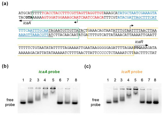 - Jefferson, K.K.; Pier, D.B.; Goldmann, D.A.; Pier, G.B. The Teicoplanin-associated locus regulator (TcaR) and the Intercellular adhesin locus regulator (IcaR) are transcriptional inhibitors of the ica locus in Staphylococcus aureus. J. Bacteriol. 2004, 186, 2449–2456. [Google Scholar] [CrossRef]