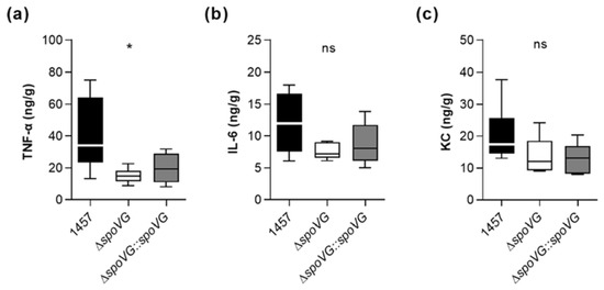 Notably, mice infected with strain 1457 contained at this late stage of infection still more than twice as much of TNF-α in the infected tissue as mice infected with the isogenic ΔspoVG mutant (Figure 9a). Mice infected with the wild-type strain also possessed higher IL-6 and KC level in the infected tissue than mice infected with the ΔspoVG mutant (Figure 9b,c), however, these differences were not statistically significant. In combination with the CFU data obtained with this animal model at the infection sites (Figure 8b,c), these cytokine expression data suggest that SpoVG expressing S. epidermidis isolates elicit a long-lasting enhanced inflammatory response at the infection site leading to an increased tissue swelling, albeit without markedly altering the bacterial burden at the infection site.