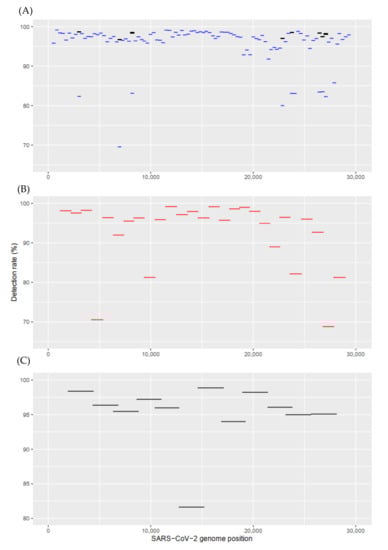 To synthesise the SARS-CoV-2 genome-equivalent amplicons for tiling sequencing, three primer sets were explored, which contain 99, 29, and 14 primer pairs in connection to the resulting amplicon length of 400 bp [9,16,19,22,27,28,29,30], 1200 bp [21,31], and 2500 bp [15,32], respectively (Table 1). We examined in silico these primer sets against 848,003 complete SARS-CoV-2 sequences in the NCBI database (14 February 2022) and considered that PCR products were only obtained when both the paired primer sequences were matched to the genome of the target. The number of targeted genomes containing specific primer pairs was counted. An amplicon-wise detection rate corresponding to each primer pair was determined (Figure 1). For primer set I, the detection rates of V4 primers ranged from 69.56% to 99.14%; however, only 81,279 (9.58%) of the targeted genomes contained all 99 primer pairs. Some primers were updated in V4.1 (black lines in Figure 1A), but the targeted genomes were only increased to 123,195 (14.53%). This suggests that primer set I is unlikely to obtain high-quality consensus genomes (without Ns). Although primer sets II and III yielded higher values, their detection rates were unsatisfactory at 28.30% and 58.53%, respectively (Table 1). Particularly for the spike gene, 14, 4, and 2 primer pairs were required for the three primer sets to yield the corresponding rates at 59.49%, 76.19%, and 92.20% (Table 1). Primer set I was incapable of offering complete information about the spike gene.