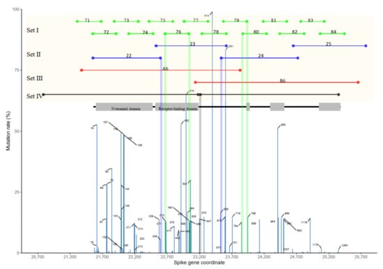 Coordinates of primer sets and the mutation rate of spike protein based on the hCov19 Mutation Dashboard on 12 February 2022. Green, blue, red, and black horizontal lines represent primer set I, set II, set III, and our primer set (set IV) covering the spike gene of SARS-CoV-2, respectively.