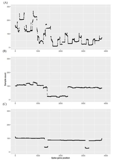 Sample count profiles with sequencing depth <25 across the spike gene. A total of 3000 Nanopore sequencing runs of SARS-CoV-2 samples downloaded from Sequence Read Archive (SRA). One thousand sequencing runs of (A) set I with AvgSpotLength < 600 bp; (B) set II, 600–1600 bp; and (C) set III, ≥1600 bp.