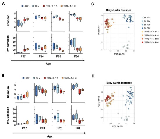Compositional differences in gut microbiota between B6 and TCR β–/–δ–/– mice were investigated by 16S rRNA gene sequencing. Sequencing data resulted in 2207 different amplicon sequence variants (ASV) belonging to 1095 unique assigned taxonomies at the genus level. All samples with a read count below 5000 were omitted from further analysis, resulting in a minimum and maximum number of reads per sample of 5115 and 114,609 with a median of 57,799 reads. Fecal (n = 6 per sex per genotype) and cecal samples (n = 6 per sex per genotype) were analyzed separately for all diversity measurements. The developmental trajectory of alpha diversity differed in B6 and TCR β–/–δ–/– mice (Figure 1). In B6 mice, alpha diversity, measured by Shannon and Inverse Simpson indices in both fecal and cecal samples, increased over postnatal development with notable stepwise increases in alpha diversity post-weaning (P24 > P17) and post-puberty (P84 > P28). In contrast, alpha diversity in TCR β–/–δ–/– mice was higher at P17 (pre-weaning) compared to B6 mice in both fecal and cecal samples. However, there was no additional increase in alpha diversity over the post-weaning and post-puberty time periods, resulting in reduced alpha diversity at P28 (pre-puberty) and adult (post-puberty) in TCR β–/–δ–/– mice compared to B6 mice. No sex differences were observed in alpha diversity (p > 0.05 for all timepoints).