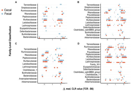Differentially abundant taxa between C57Bl/6 (B6) and T cell receptor double knock out (TCR β–/–δ–/–) mice. Individual graphs represent results at (A) P17, (B) P24, (C) P28, and (D) 12 weeks. Each circle represents an individual ASV that was significantly increased or decreased between genotypes, with the median difference in CLR-transformed relative abundance plotted on the X-axis. Positive values represent taxa that are significantly more abundant in TCR β–/–δ–/– mice compared to B6 controls, whereas negative values represent those significantly more abundant in B6 mice.