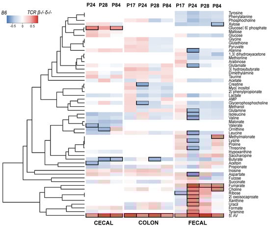 Metabolic variation of cecal, colon and fecal samples associated with genotype. The heatmap illustrates the correlation coefficient ® obtained from OPLS models at individual timepoints for cecal, colon and fecal samples. Metabolites overrepresented in (C57Bl/6) B6 mice are shown in blue, those overrepresented in T cell receptor double knock out (TCR β–/–δ–/–) mice are shown in red. Black squares indicate correlations with r > │0.5│.