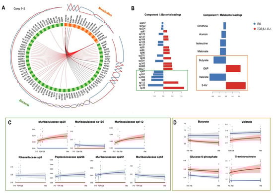 Integration of metabolic and bacterial abundance data. (A) Circos plot of the multi-block relationships across two principal components associated with T-cell deficiency. The correlation between variables of different blocks (metabolites in orange, bacteria in green) are shown with red (if positive association) or black (if negative association) inner lines. The expression level of each variable is also shown as the blue (expression level in B6) and red (expression level in T cell receptor double knock out (TCR β–/–δ–/–) mice) lines on the outside of the circle. Only absolute correlations higher than 0.6 are shown. (B) Loading weights showing the best discriminating features on PC1 for both bacteria (left) and metabolites (right) blocks. The X-axis represents the coefficient weight of the variables listed on the Y-axis. In blue are the variables that have the maximum level of expression in B6, in red those maximally expressed in TCR β–/–δ–/–. (C) Trajectories of the top seven bacterial taxa (as per loading weights in panel B) across developmental timepoints in TCR β–/–δ–/– (red) and B6 mice (blue), supporting the correlations highlighted by the Circos plot. (D) Trajectories of the top four metabolites (as per loading weights in panel B across developmental timepoints in TCR β–/–δ–/– (red) and B6 mice (blue), supporting the correlations highlighted by the Circos plot. Shaded areas represent the confidence interval around smooth lines obtained by constructing a linear model with the formula y ~ log(x), where x = age and y = metabolite/bacterial abundance.