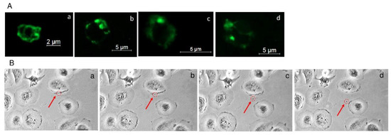 (A) EVs from different cell lines labeled with Caveolin-1 and imaged by confocal microscopy: (a,b)—EVs isolated from CGTH; (c)—EVs isolated from TPC-1; (d)—EVs isolated from FTC-133, (green—Alexa Fluor 488); (B) Representative images of EVs’ release from the 8505c cell line (automatic sequential microscopic image registration (a–d) arrow—released EV).