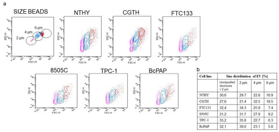 Analyzing the sizes of extracellular vesicles (EVs) released by thyroid cancer cell lines. (a). Gating strategy for analyzing EV sizes. Visualization of size beads (with diameters of 2, 4, and 6 μm) shown in a forward scatter (FSC) and side scatter (SSC); (b). Size distribution of EVs released by the different thyroid cell lines. NTHY: cell line derived from normal human thyroid follicular cells; CGTG: Thyroid gland squamous cell carcinoma; FTC-133: follicular thyroid carcinoma; 8505c: anaplastic thyroid carcinoma; TPC-1: thyroid gland papillary carcinoma; BcPAP: thyroid gland papillary carcinoma. Full characteristics of the used cell lines are provided in Supplementary Table S1.