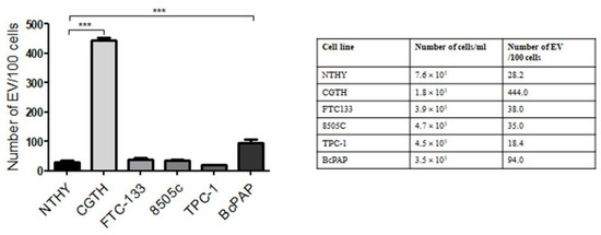 The average number of extracellular vesicles (EVs) released by thyroid cell lines per 100 cells. Data are shown as means with standard deviations (±SEM). ***: p < 0.001.