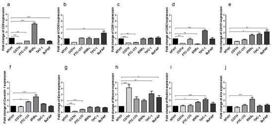 Relative expression of tetraspanins (a–e); Caveolin-1 (f); Ezrin (g); Moesin (h); Radixin (i); and Alix (j) in thyroid cell lines. Data are reported as means with standard deviation (±SEM). *: p < 0.05; ** p < 0.01; ***: p < 0.001.