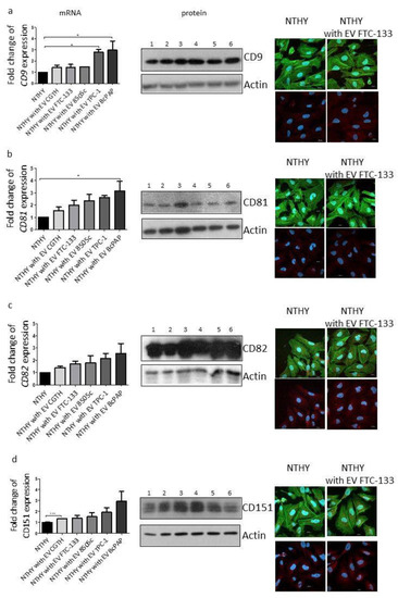The effects of EVs derived from thyroid cancer cells on the function of normal thyroid cells, NTHY, were then analyzed. To this effect, the expression of the canonical EV markers by these cells was analyzed following a five-day incubation with cancer-derived EVs. The expression levels of CD9 were significantly higher in the NTHY cells cultured with EVs isolated from TPC-1 (p < 0.05) and BcPAP (p < 0.05) cells, compared with the control NTHY cells (not incubated with EVs; Figure 5a). No difference in the CD63 expression was observed (data not shown). NTHY cells that were incubated with EVs isolated from BcPAP showed a statistically significantly higher expression of CD81 (p < 0.05) compared to the control NTHY cells (Figure 5b). The expression levels of CD82 did not differ from those in the NTHY cells cultured with EVs (Figure 5c). CD151 expression was significantly higher in cells cultured with EVs isolated from CGTH cells (p < 0.001) compared to untreated cells (Figure 5d). The protein expression of all tetraspanins is shown in Figure 5c and in Supplementary Figure S3.