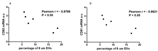 Incubating NTHY cells with EVs isolated from thyroid cancer cell lines did not affect the Alix, Moesin and Radixin expression (data not shown). Caveolin-1 expression was significantly higher in the NTHY cells incubated with EVs isolated from BcPAP cells (p > 0.05), while Ezrin expression levels were higher in the NTHY lines incubated with EVs secreted by 8505c cells (data not shown). Next, we searched for the potential functional associations between the specific EVs’ fractions and the observed effect in changes of tetraspanin expression. To this end we analyzed the correlations between the numbers of EVs of specific sizes released by thyroid cancer cells and the expression of tetraspanins in the NTHY cells treated by the EVs. We investigated the correlation between the levels of EVs released by the thyroid cancer cell line and the expression of selected genes in the NTHY cells which were incubated with EVs. The analyses showed that there was a negative correlation between the percentage of 6 µm EVs and the expression levels of CD63 and CD81 (Figure 6).