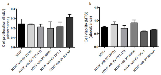 The effect of thyroid cancer-derived extracellular vesicles (EVs) on NTHY (normal thyroid) cell proliferation and viability. (a): cell proliferation results by BrdU assay; (b): cell viability results by MTS assay.