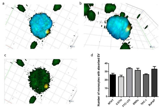 Internalization of thyroid cancer-derived extracellular vesicles (EVs) by monocytes. (a–c): a 3D model of internalized EVs visualized by confocal microscopy (Zen software—ZEISS). Actin has been stained with Phalloidin-FITC (green), EV Caveoiln-1 with AF 594 (red), and nucleic DNA with DAPI (blue). (a,b): a monocyte with internalized EV in two different positions; (c): a monocyte with internalized EV without a channel for nucleus. (d): numbers of monocytes with absorbed EVs, released by different thyroid cell lines.