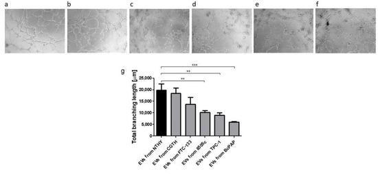 The effect of thyroid-derived EVs on angiogenesis. Upper panel: microscopic analysis of tube formation assay after 5 h: HUVEC cells incubated with: (a)—EVs from NTHY; (b)—EVs from CGTH; (c)—EVs from FTC-133; (d)—EVs from 8505c; (e)—EVs from TPC-1; (f)—EVs from BcPAP; Lower panel: (g)—total branching length (Data are reported as mean ± SEM, **: p < 0.01, ***: p < 0.001).