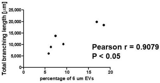 In contrast, no correlation was observed for other EVs’ fractions (Supplementary Figure S7). The analysis of a correlation between EV numbers and the total length of branches in the tube formation assay showed a positive correlation between the percentage of 6-µm EV and the pro-angiogenic potential of the cells (Figure 10). In contrast, no correlation was observed for the other EV fractions (Supplementary Figure S7).
