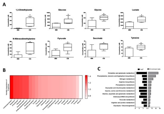 NMR spectroscopy reveals different metabotypes between obese and normal-weight OA patient synovial fluid (A) Concentration (μM) of selected metabolites that was found to be significantly different in synovial fluid from obese (OB; n = 5) and normal-weight (NW; n = 6) OA patient synovial fluids. * = p < 0.05; (B) top metabolites ranked on Variable Importance in Projection (VIP) score between obese (OB; n = 5) and normal-weight (NW; n = 6) OA synovial fluid; (C) enrichment analysis using MetaboAnalyst, of metabolites with VIP scores ≥1 between obese and normal-weight synovial fluids, showing enrichment ratio and associated p-values for the most relevant metabolic pathways.