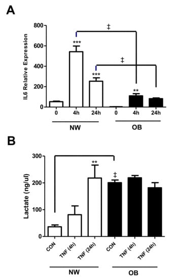 Lactate secretion is greater in obese OA synovial fibroblasts and is induced during the inflammatory response. The effect of TNFα (10 ng/mL) stimulation of synovial fibroblasts from normal-weight (NW) or obese OA patients (n = 3) on (A) the expression of IL-6 and (B) secretion of lactate after 4 h and 24 h stimulation. Data expressed as mean ± SEM. ** = p < 0.01, *** = p < 0.001, significantly different from time 0. ‡ = p < 0.01, significantly different between synovial fibroblasts from patients with different BMI.