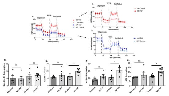 Obese and normal-weight OA synovial fibroblasts exhibit differential mitochondrial respiration. (A–C) OA synovial fibroblasts from obese patients (n = 6 patients, with 5 biological replicates per patient) stimulated with TNFα at 10 ng/mL for 24 h show increased mitochondrial respiration, compared to fibroblasts from normal weight patients. (D) Non-mitochondrial oxygen consumption does not increase in OA synovial fibroblasts from obese or normal weight patients with TNFα stimulation. (E) basal respiration; (F) maximal respiration; and (G) ATP production from mitochondrial respiration significantly increase in obese OA synovial fibroblasts when stimulated with TNFα at 10 ng/mL for 24 h. All data presented as mean ± SEM. * = p < 0.05, ** = p < 0.01.
