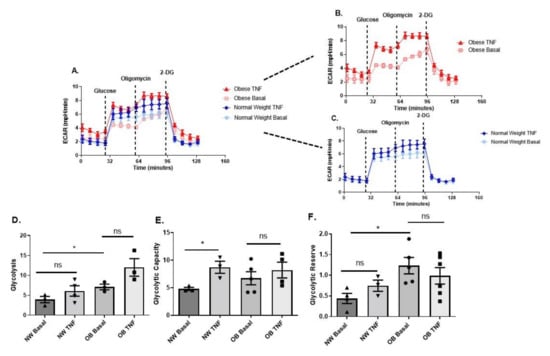 Analysis of glycolytic metabolism revealed that obese OA synovial fibroblasts also exhibited significantly greater basal glycolysis and glycolytic reserve, compared to basal normal-weight fibroblasts (Figure 4A–D,F). However, unlike the obese fibroblasts, normal-weight fibroblasts were capable of increasing glycolytic capacity when stimulated with TNFα (Figure 4F).