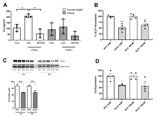 Inhibition of glutaminase-1 attenuates the IL-6 inflammatory response in OA synovial fibroblasts. (A) GLS1 inhibitor, BPTES (20 µM), attenuates TNFα induced IL-6 secretion in synovial fibroblasts from normal weight and obese hip OA patients (n = 3 patients). Bars represent mean IL-6 secretion (pg/mL). (B) % knockdown of GLS1 expression in OA synovial fibroblasts after 24 h post-transfection with a GLS1 targeting siRNA (5 nM or 100 nM), compared to a non-targeting control (NTC) siRNA (n = 4 patients). (C) Confirmation of siRNA-mediated GLS1 protein knockdown at 24 h and 48 h post-transfection using 100 nM siRNA. (D) Effect of sRNA-mediated knockdown of GLS1 on IL-6 expression in OA synovial fibroblasts at 24 h post-transfection (n = 4 patients). Data are presented as mean ± SEM. * = p < 0.05, ** = p < 0.01, *** = p < 0.001.