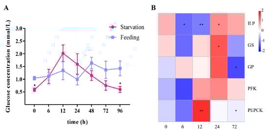 Effects of starvation treatment on hemolymph glucose and the expressions of LvILP and glucose metabolism genes in L. vannamei. (A) The variation curve of hemolymph glucose concentration during 4 days of starvation; error bars indicate the mean ± SD of three replicate samples. (B) Heatmap of the relative expression levels of LvILP, GS, GP, PFK, and PEPCK at different time points relative to the control group. The redder color indicates a higher expression level, and the bluer indicates a lower expression level. The numbers at the bottom represent the starvation time (h). The expression levels of the genes were detected by RT-qPCR, and 18 S rRNA was used as an internal reference. Statistical significances are shown as * p < 0.05 and ** p < 0.01.