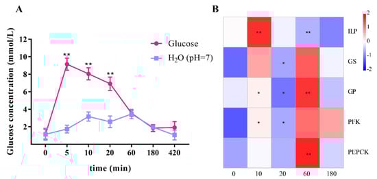 Effects of glucose injection on hemolymph glucose and the expressions of LvILP and glucose metabolism genes. (A) The variation curve of hemolymph glucose concentration of L. vannamei within 420 min of glucose injection; error bars indicate the mean ± SD of three replicate samples. (B) Heatmap of the relative expression levels of LvILP, GS, GP, PFK, and PEPCK genes at different time points relative to the control group. The redder color indicates a higher expression level, and the bluer indicates a lower expression level. The numbers at the bottom represent the treatment time (min). The expression levels of the genes were detected by RT-qPCR, and 18 S rRNA was used as an internal reference. Statistical significances are shown as * p < 0.05 and ** p < 0.01.