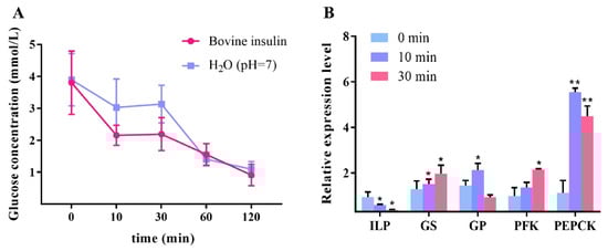 Effects of bovine insulin injection on hemolymph glucose and the expressions of LvILP and glucose metabolism genes. (A) The variation curve of hemolymph glucose concentration of L. vannamei after in vitro injection with bovine insulin. (B) Changes of the relative expression levels of LvILP, GS, GP, PFK, and PEPCK at 0 min, 10 min, and 30 min after injection with bovine insulin. The expression levels of the genes were detected by RT-qPCR, and 18 S rRNA was used as an internal reference. Error bars indicate the mean ± SD of three replicate samples. Statistical significances are shown as * p < 0.05 and ** p < 0.01.