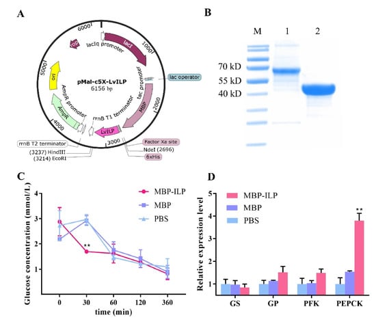 Effects of the recombinant maltose-binding protein (MBP)–LvILP protein injection on hemolymph glucose and the expressions of glucose metabolism-related genes. (A) The recombinant plasmid map of pMal-c5X-LvILP. (B) Sodium dodecyl sulfate-polyacrylamide gel electrophoresis (SDS-PAGE) electrophoresis of the recombinant MBP–ILP protein and the MBP protein. ‘M’ indicates a PageRulerTM prestained protein ladder (Thermo Fisher Scientific, 26619); ‘1’ indicates purified MBP-ILP protein (63 kD); and ‘2’ indicates purified MBP protein (45 kD). (C) The variation curve of hemolymph glucose concentration within 6 h after recombinant LvILP protein injection. (D) The relative expression levels of GS, GP, PFK, and PEPCK at 12 h after injection of recombinant ILP protein. The gene expression levels were detected by RT-qPCR, and 18 S rRNA was used as an internal reference. Error bars indicate the mean ± SD of three replicate samples. Statistical significances are shown as ** p < 0.01.