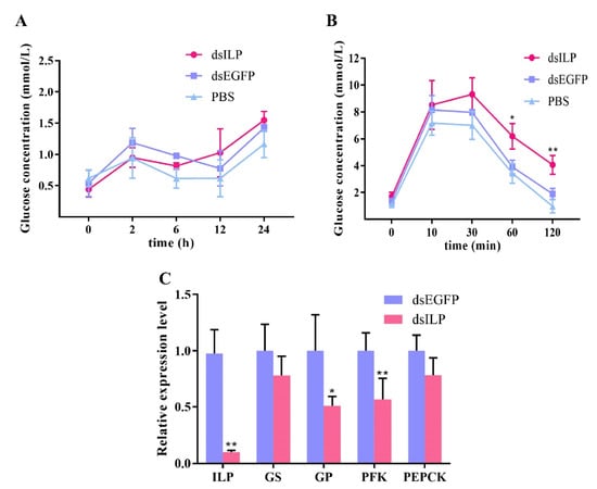 Effects of LvILP interference on hemolymph glucose and the expressions of glucose metabolism genes. (A) The variation curve of hemolymph glucose concentration within 24 h after RNAi of LvILP. (B) The variation curves of hemolymph glucose concentration within 2 h after glucose was injected into the LvILP RNAi shrimp. (C) The expression levels of LvILP and the glucose metabolism genes at 24 h after dsLvILP injection. Error bars indicate the mean ± SD of three replicate samples. Statistical significances are shown as * p < 0.05 and ** p < 0.01.