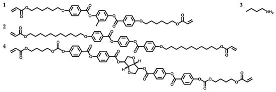 Diacrylate liquid crystal Monomer 1, diacrylate liquid crystal Monomer 2, Chiral Dopant 3, and n-butylamine were added in a vial, dissolved in THF, and stirred at room temperature (~25 °C) for 24 h. Then, the mixture was stirred at 100 °C for another 18 h, and the THF was allowed to evaporate during oligomerization. The THF was further removed in a vacuum oven at 50 °C overnight.