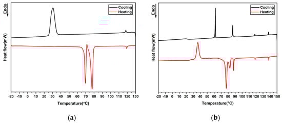 The synthesis of the main-chain CLC oligomers was carried out using a previously described procedure, by mixing achiral LC Monomer 1, achiral LC Monomer 2, right-handed chiral LC Monomer 4, and butylamine 3 [,,,,]. The chemical structures of all materials are shown in Figure 1. During the polymerization, a repeated Michael addition reaction takes place. Control of the degree of polymerization (DP) of the oligomer is achieved by adjusting the ratio between acrylate groups and amine groups. Monomer 1 is a nematic diacrylate liquid crystal monomer (see the differential scanning calorimetry (DSC) curves in Figure 2a), and Monomer 2 is a diacrylate liquid crystal monomer that can exhibit smectic and nematic liquid crystal phases (see the DSC curves in Figure 2b and polarizing optical microscopy (POM) images in Figure S1). Butylamine 3 acts as a chain extender for the Michael addition reaction. Monomer 4 is a chiral dopant for the formation of the cholesteric liquid crystal phase. The mixture was dissolved in tetrahydrofuran (THF) and stirred at 25 °C for 24 h to ensure the formation of secondary amines. Then, the reaction was carried out at 100 °C for another 18 h to form tertiary amines and complete the oligomerization. The vial was placed in a vacuum oven at 50 °C overnight to remove the remaining THF. The material was viscous and stable at room temperature for months, similar to the material reported in our previous research []. By varying the ratio of LC Monomer 2 to Monomer 1, specific compositions were obtained. The molar ratios of LC Monomer 1 to Monomer 2 for each sample are listed in Table 1. The concentration of the chiral dopant was always kept at 5 mol%.