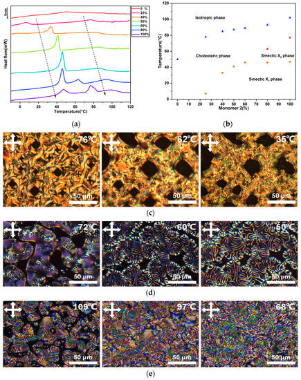 The phase behaviors of the CLC oligomers with different compositions were studied. DSC was measured between −10 °C and 120 °C to find the phase transition temperatures (Figure 3a,b). After aligning the oligomers by shear force between two flat glass substrates, the samples with obvious defect structure were selected so that the characteristic textures of the CLC oligomers with different concentrations of Monomer 2 could be determined using POM under slow cooling (Figure 3c–e).