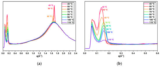To further confirm the phase behavior caused by the smectic monomer, XRD measurement of the oligomer with 25% Monomer 2 was utilized to accomplish the mesophase identification (Figure 4a,b). The measurement showed a diffraction peak at different temperatures located at around 0.14 Å−1, which was an obvious indication of the smectic order due to its ordered structural arrangement. The peaks at around 1.7 Å−1 represent the side-by-side intermolecular distance, which can be detected in both the nematic and smectic phases. At higher temperatures, the peaks were diffuse with lower intensity. As the temperature decreased, the molecular orientation became more ordered, which led to the diffraction peak becoming sharper and more pronounced. The appearance of the smectic structure through the cholesteric phase made the peaks intensity increase with decreasing temperature, and an especially dramatic shift was observed when cooled down from 60 °C to 50 °C in both the wide- and small-angle section of the XRD spectra, indicating an obvious and gradual cholesteric-smectic pre-transitional effect of the cholesteric liquid crystal oligomers. In comparison to the XRD results, the POM and DSC data show an isotropic to cholesteric transition at ~80 °C and a cholesteric-to-smectic transition below room temperature. The temperature range is not consistent precisely with the temperature range found in the XRD data, indicating the wide range of the pre-transitional effect starting at 60 °C. While the increase in the intensity of the small-angle peak can be explained by an increase in smectic domains, the sharpening of the peak at 1.7 Å−1 is not so easily explained, as it should not be strongly affected by the presence of such domains. While it is possible that the sharpening of this peak is caused by the presence of exotic smectic phases in the system, there is currently not enough evidence to draw such conclusions. The results support that the pre-transitional effect is present and enhanced by the incorporation of Monomer 2.
