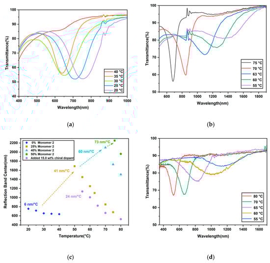 Ultraviolet–visible–IR (UV–vis–IR) spectroscopy was used to study the temperature-responsive properties of the oligomers with various compositions. The most well-aligned samples, based on their transparency and POM images, were chosen for these experiments (Figure S4). By analyzing the transmittance spectra of the film at different temperatures, we compared the temperature response properties of the oligomers with different amounts of Monomer 2. The spectrum of the film with no Monomer 2 only showed a reflection band shift from 644 nm to 755 nm upon cooling from 40 °C to 20 °C, for a total of 111 nm red shift (Figure 5a). No reflection band could be measured above 40 °C. In our previous research, for the cholesteric liquid crystal oligomer with no Monomer 2 and containing less chiral dopant (4.3 mol%), when cooled down from 75 °C to 40 °C, the reflection band underwent a 175 nm red shift from 700 nm to 875 nm []. Upon further cooling from 40 °C to 20 °C, 225 nm red shift from 875 nm to 1100 nm was obtained. Although the position of the reflection band shifted, the steepness between 75 °C and 20 °C was only 7.27 nm/°C. In comparison, the spectrum of the oligomer with 25% Monomer 2 showed a 1010 nm band shift from 680 nm to 1690 nm between 75 °C and 50 °C, which showed a broader band-shift range (Figure 5b). Oligomers with a larger amount of Monomer 2 were also investigated. The central wavelengths of the reflection bands of different oligomers were plotted against temperature (Figure 5c).