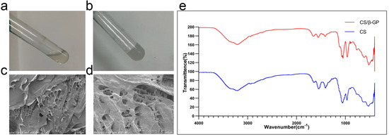 Hydrogel synthesis and characterization. (a) The solidification state of CS/β–GP hydrogel. (b) Chitosan solution. (c) Scanning electron microscopy (SEM) image of chitosan solution. (d) Crosslinked CS/β–GP SEM image. (e) FTIR spectrum of uncrosslinked CS solution and crosslinked CS/β–GP hydrogel. Scale bars: (c,d) = 500 μm.
