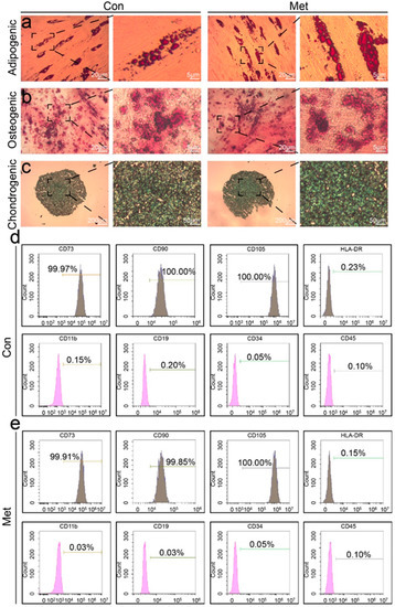 Characterization of GMSCs and Met–GMSCs. (a) Oil red O staining image after induction by only adding adipogenic induction medium (Con) and adipogenic induction medium containing metformin (Met). Scale bar = 20 μm, 5 μm. (b) Alizarin red staining image after only adding osteogenic induction medium and osteogenic induction medium containing metformin. Scale bar = 20 μm, 5 μm. (c) Alcian blue staining after induction with only chondrogenic induction medium and chondrogenic induction medium containing metformin. Scale bar = 200 μm, 50 μm. (d) The surface biomarkers of GMSCs cultured in complete medium detected by flow cytometry. Most cells express CD73+, CD90+, and CD105+. The cells are negative for CD34, CD11b, CD19, CD45, and HLA–DR. (e) The surface biomarkers of GMSCs cultured in a complete medium supplemented with metformin were detected by flow cytometry.