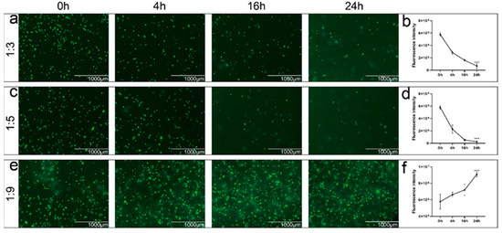 To detect the influence of CS/β–GP hydrogel on cell viability and to determine the optimal concentration ratio of cultured cells, we chose three proportioning schemes and mixed GFP–GMSCs with different concentrations of the hydrogel. When the volume ratio of β–GP to CS was 1:3 and 1:5, the fluorescence brightness gradually decreased between 0 and 24 h (Figure 3a,c). The quantified fluorescence intensity graph showed that the fluorescence intensity was greatly reduced between 0 and 24 h (Figure 3b,d), indicating that the cell viability of the cells under these two concentrations was reduced and cell apoptosis occurred. When the volume ratio of β–GP to CS was 1:9, the fluorescence brightness gradually increased between 0 and 24 h, and at 24 h, and the cells adhered and grew in the hydrogel and spread out in a fibrous shape (Figure 3e). The intensity quantification chart showed that the fluorescence intensity gradually increased between 0 and 24 h (Figure 3f), and the cell activity was the highest at this concentration.