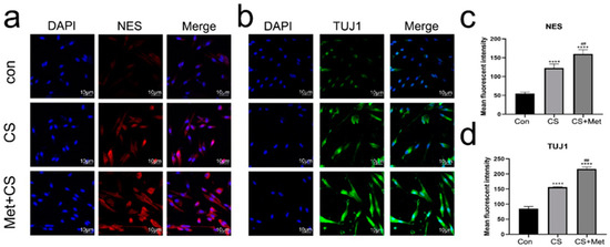Characterization of immunofluorescence image of neural differentiation of GMSCs. (a) Immunofluorescence image of NES protein in Con group, CS Group, and Met–CS group. The red fluorescence represents NES. (b) Immunofluorescence image of TUJ1 protein in Con group, CS Group, and Met–CS group. The green fluorescence represents TUJ1. (c) Statistical graph of average fluorescence intensity of NES protein. (d) Statistical graph of average fluorescence intensity of TUJ1 protein. Con, control group; CS, chitosan hydrogel cultured group; Met–CS, cells under chitosan hydrogel culture with entrapment metformin and growth factor. Data are expressed as the mean ± SEM; n = 3, p < 0.0001 ****.