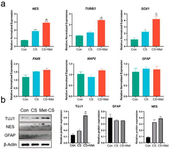 We assumed that the neural differentiation potential of GMSCs in Met–CS was higher than that in CS. To verify this conclusion, after 14 days of cell culture in chitosan hydrogel, the expression of neural–related markers at the level of RNA and protein was detected. Immunofluorescence detected the NES and TUJ1 proteins, which are neural–related markers, among which NES protein is a marker of neural stem cells, and TUJ1 protein is a marker of early immature neurons [22]. GMSCs derived from the mesoderm neural crest can express weak NES and TUJ1 proteins. Under the CS and Met–CS culture environment, the fluorescence intensity of NES and TUJ1 proteins was enhanced (Figure 4a,b), and this implied that the cultural environment of the hydrogel promoted the neural differentiation of GMSCs cells. Moreover, the quantitative graph of the average fluorescence intensity shows that the protein expression level of NES and TUJ1 in the Met–CS group had a significant increase (p < 0.001) compared with the CS culture system (Figure 4c,d). The mean fluorescence intensity was calculated by randomly selecting five fluorescence images from each well after 14 days. Consistent with the results of immunofluorescence, NES and TUBB3 genes encoding NES and TUJ1 were observed to be highly expressed in the Met–CS culture system compared with the Con and CS groups (Figure 5a). In addition, in the Met–CS group and the CS group, SOX1 has a significant increase in RNA level; Sox1 is believed to maintain the cell cycle and promote the self–renewal of neural stem cells [23]. In the Met–CS group, the expression of PAX6 gene increased, and PAX6 gene was expressed in the early neuroectoderm, which directed regulation of the differentiation of neural stem cells and was related to the growth and development of the optic nerve [24]. There was no significant change in the expression of MAP–2 and GFAP. MAP–2 is a neuronal phosphoprotein, which is related to neuron morphology and cytoskeletal dynamics and is considered a marker of mature neurons [25]. GFAP protein is glial fibrillary acid, which is considered a marker of astrocyte and oligodendrocyte [26]. Moreover, the semi–quantitative results of protein expression by Western blot also showed that NES and TUJ1 had a significant increase (p < 0.01) in expression in the Met–CS culture system compared with the control group and the CS group (Figure 5b). The statistical results showed that the CS culture system had a significant increase in the protein and gene expression of NES when compared with the control group (p < 0.01), while the increase in TUJ1 was not significant (Figure 5b). In RNA and protein expression, the expression of GFAP did not change significantly. It can be seen that GMSCs showed no significant change in the expression of markers in mature neurons after induction by our method.